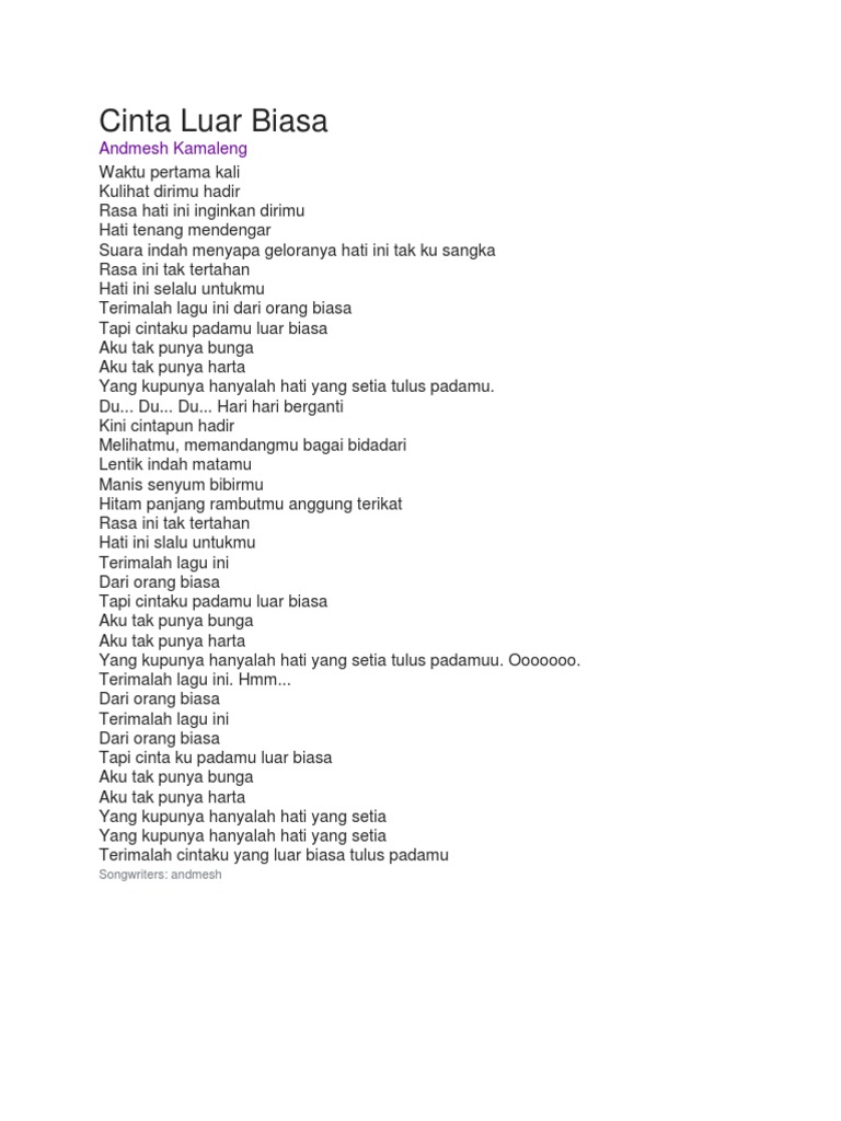 Tapi cinta ku padamu luar biasa. Hitam panjang rambutmu anggun terikat. Lirik Lagu Cinta Luar Biasa Andmesh Kamaleng.