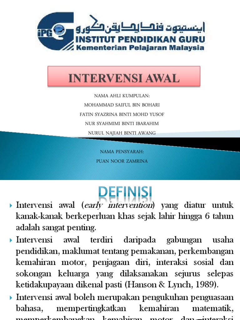 . Intervensi awal terdiri daripada gabungan usaha pendidikan maklumat tentanfg pemakanan perkembangan kemahiran motor penjagaan diri interaksi sosial dan sokongan keluarga yag dilaksanakan sejurus selepas ketidakupayaan. Beberapa contoh intervensi yang berguna termasuk membina hubungan menyesuaikan persekitaran mengurus rangsangan deria mengubah strategi komunikasi memberikan gesaan dan isyarat menggunakan proses mengajar menyemak dan mengajar semula dan membangunkan kemahiran sosial. Apa Itu Intervensi.